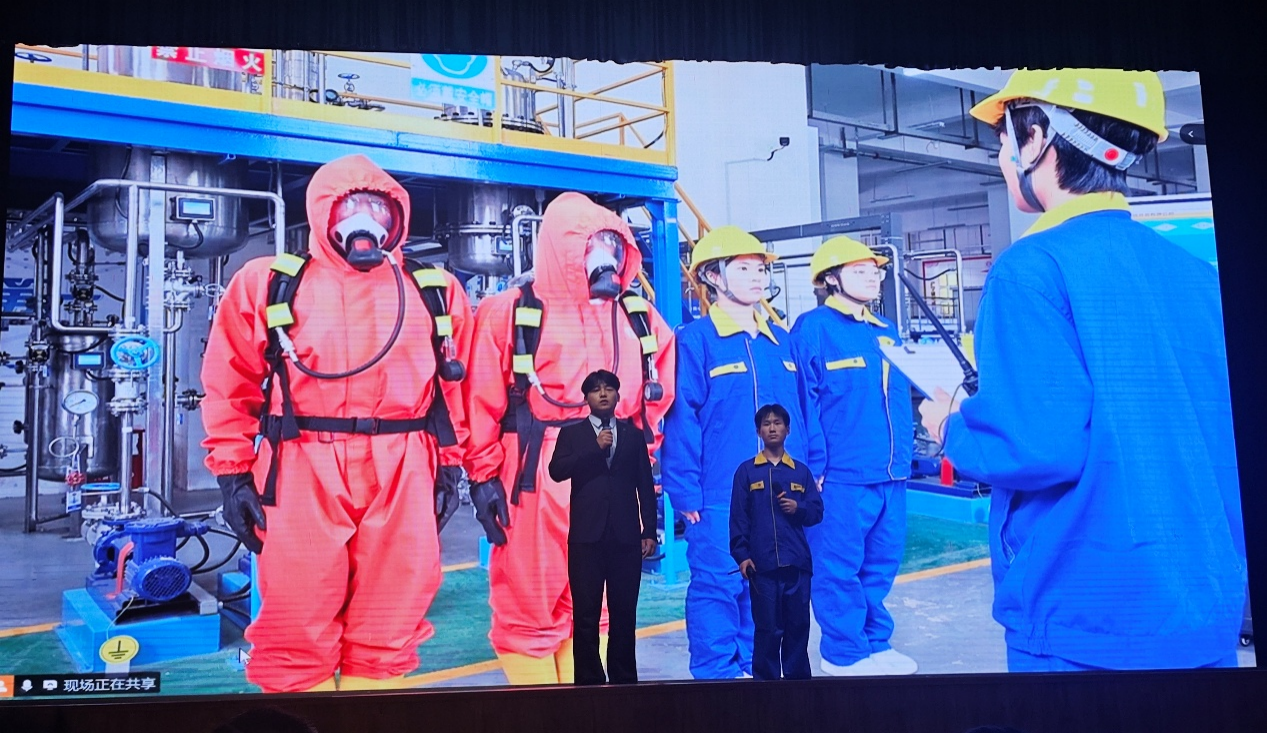 在精彩的现场展示环节中,化学工程学院以“煤制甲醇工艺分离器法兰泄漏应急处置”为主题,呈现了一场高水平的技能演练。演练模拟了法兰腐蚀引发泄漏的紧急场景,学生团队严格按照现代化工HSE应急处置法则,通过“侦检、隔离、堵漏”标准化流程,迅速控制险情。旁白解说结合LED大屏工艺流程演示,生动展现了化工安全操作的重要性。学生们的精湛技艺和沉着冷静的表现赢得了现场阵阵掌声。