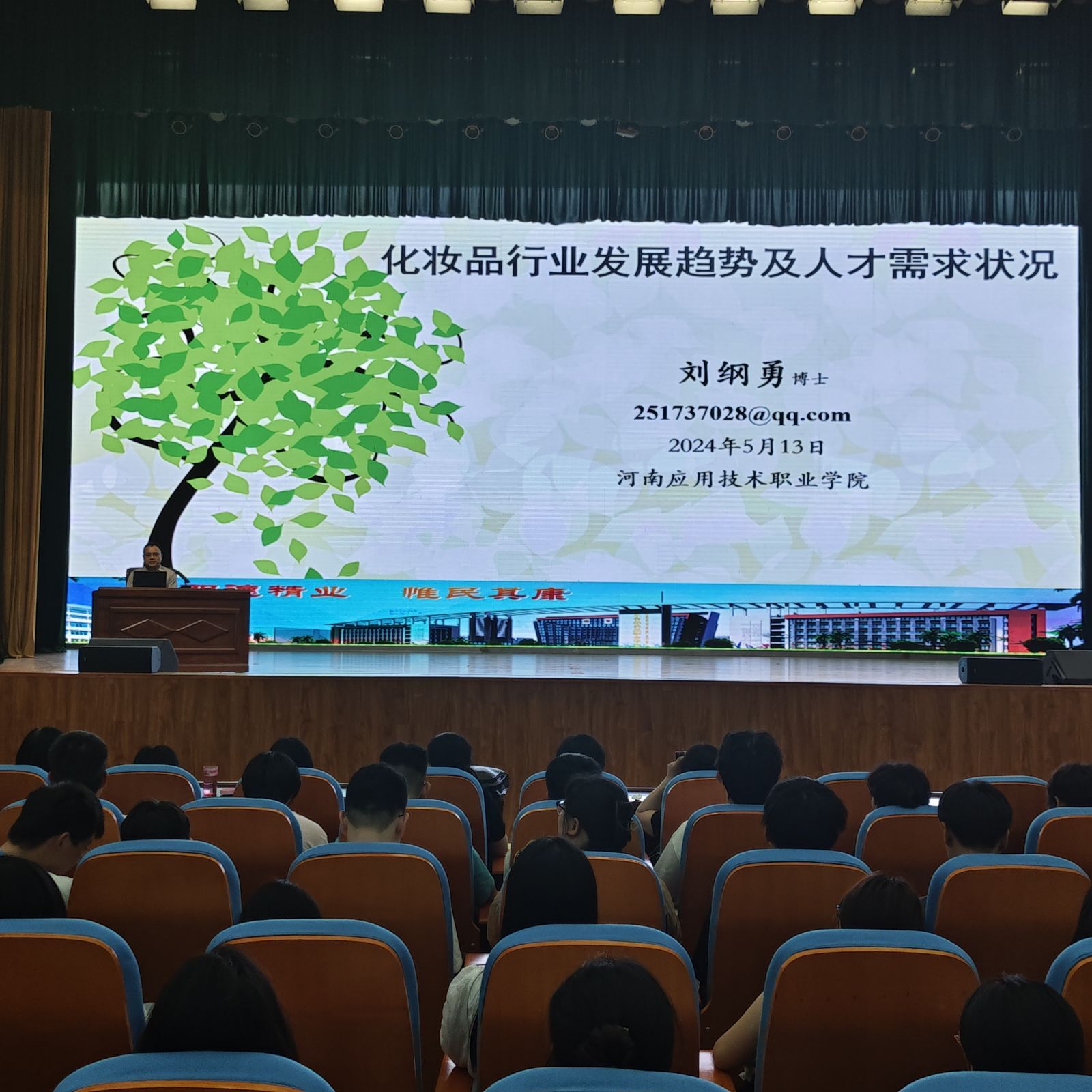 2024年5月14日,广东食品药品职业学院化妆品技术专业学科带头人、广东省化妆品科学技术研究会创始会长、全国轻工职业教育教学指导委员会日用化工专委会委员、全国药品职业教育教学指导委员化妆品专委会委员刘纲勇博士应邀来到开云指导化妆品专业建设,并给化妆品经营与管理专业全体师生作了题为《化妆品行业发展趋势及人才需求》的专题讲座。
