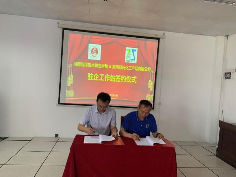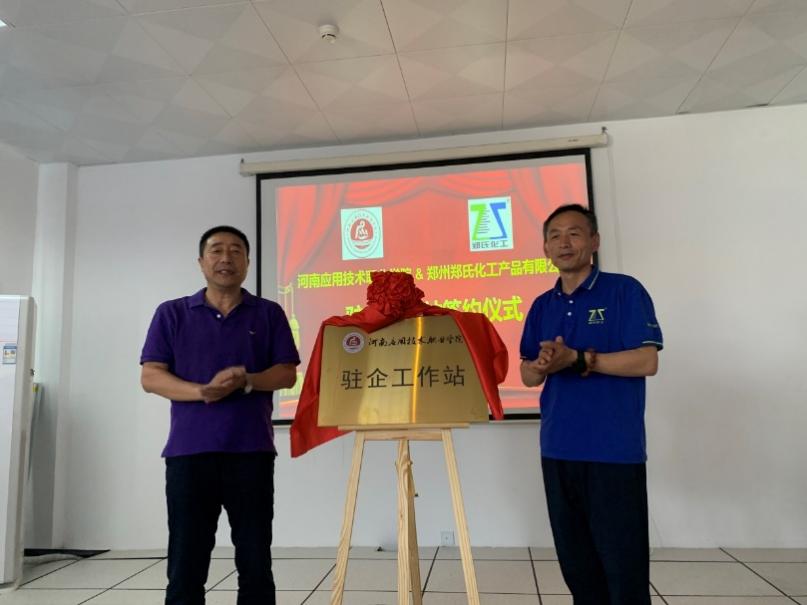 5月22日,kaiyun官方网站入口“驻企工作站”在郑州郑氏化工产品有限公司(鹤壁基地)正式挂牌成立。朱冰与郑州郑氏化工产品有限公司(鹤壁基地)郑先祥总经理分别代表校企签订了合作框架协议书,并由蔡庄红代表学校与企业共同为“驻企工作站”揭牌。