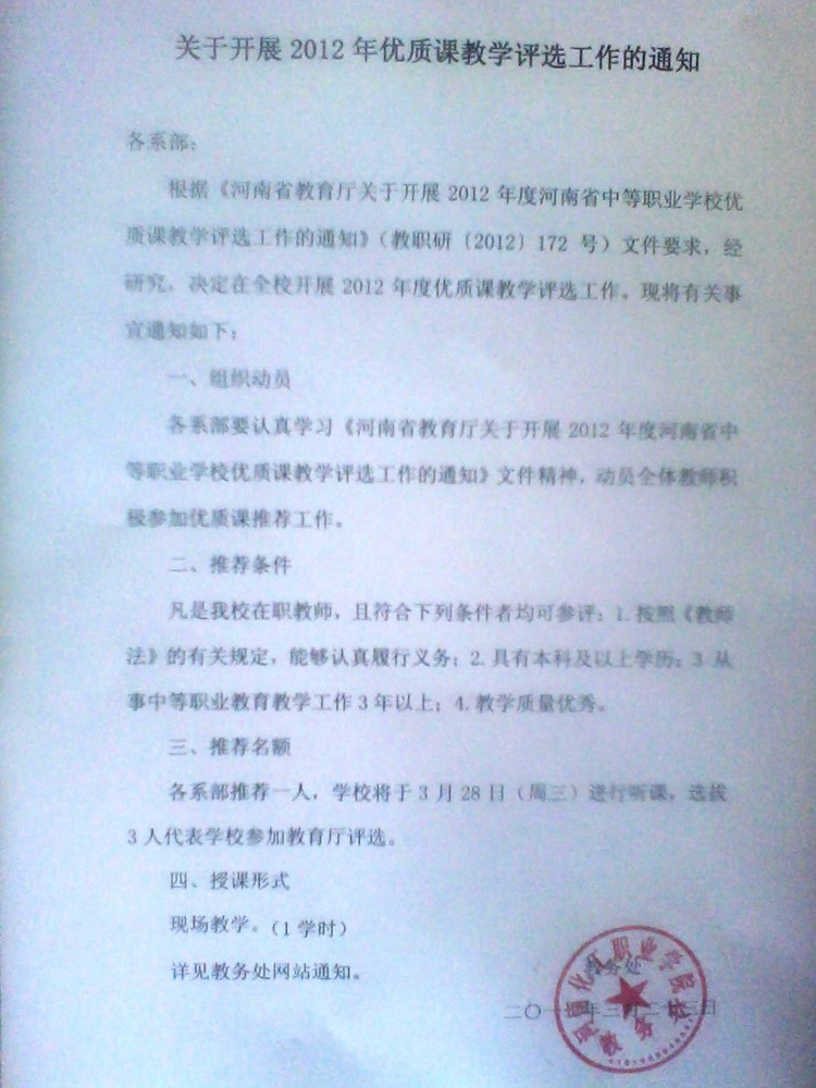 接教务处通知,开云将举行优质课评选活动,具体事项见附件。请有意参加的老师提前做好准备,并在下周一之前告知教学秘书。