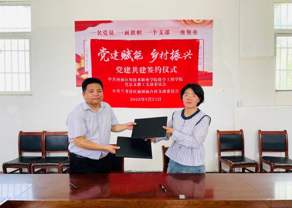 活动结束后,中共kaiyun官方网站入口化学工程学院党总支教工支部委员会与中共兰考县红庙镇庙台村党支部委员会签订《乡村振兴技术帮扶协议》,推动专业与产业对接、教学过程与生产过程对接,在党建赋能乡村振兴的同时,进一步提升应用化工技术高水平专业群建设。化学工程学院党总支书记陈永惠、党总支副书记常惟诚、副院长岳瑞丰,协管员范雨欣及驻村第一书记任旭凯、队员李盈、陈开友等共同参与签约活动。