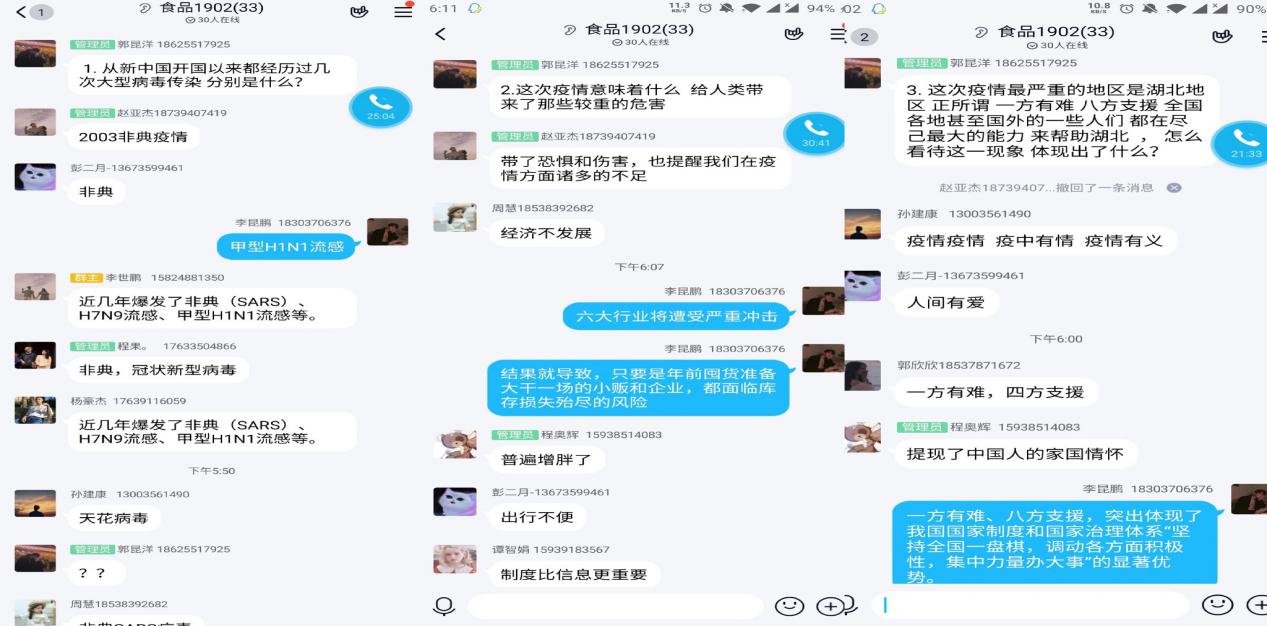 在抗击新冠肺炎疫情的关键时刻,化学工程学院积极发挥课堂教学主阵地作用,落实立德树人的根本任务,全面落实“停课不停学”文件精神,做到线上教学有序开展,“云”班会定期召开,将课程教学与疫情防控知识宣传结合在一起,将学生思想教育同了解学生动态结合在一起,将学生情况排查同学生心理问题一对一辅导结合在一起,全力落实“三全育人”的指导思想,师生教学相长,共同用行动践行时代使命,彰显青春担当。