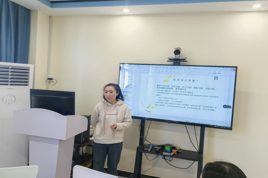 活动开始,赵容老师以大学生心理危机为切入点,从如何排查识别重点关注学生、如何开展学生约谈工作、如何做好家校协同工作及重点关注学生转介等方面进行了介绍,结合丰富的案例和实际工作经验,详细讲解了当代大学生常见的心理问题及其应对策略。她指出,随着社会竞争的加剧,大学生面临着前所未有的心理压力,如学业负担、就业焦虑、人际交往障碍等。辅导员作为学生心理健康的守护者,需要具备敏锐的观察力和专业的辅导技巧,以便及时发现并解决学生的心理问题。