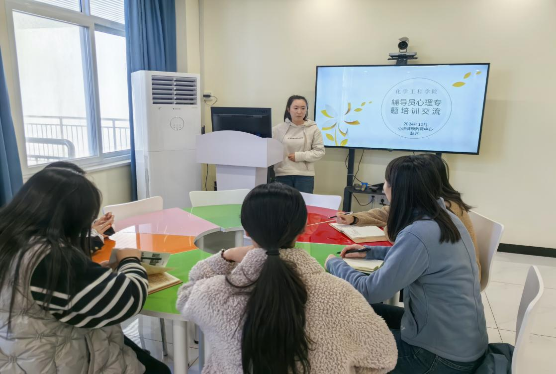 为进一步加强大学生心理健康教育,提升辅导员队伍的心理健康教育工作水平,增强对大学生心理健康问题的认识与处理能力,11月29日下午,化学工程学院在校心理督导室成功开展了辅导员心理专题培训交流会。本次活动邀请了学校心理健康中心的赵容老师作分享交流,学院全体辅导员参加了此次活动。
