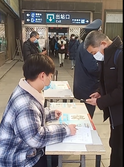 化工2003班王鹏在开封市火车站,为返乡人员测量体温登记,指导返乡人员扫描行程码等。