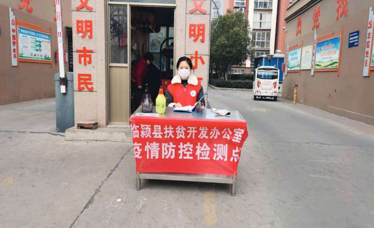 化工2001班尚珂在漯河市临颍县一小区门口,为外来人员测量体温,宣传疫情防控知识。