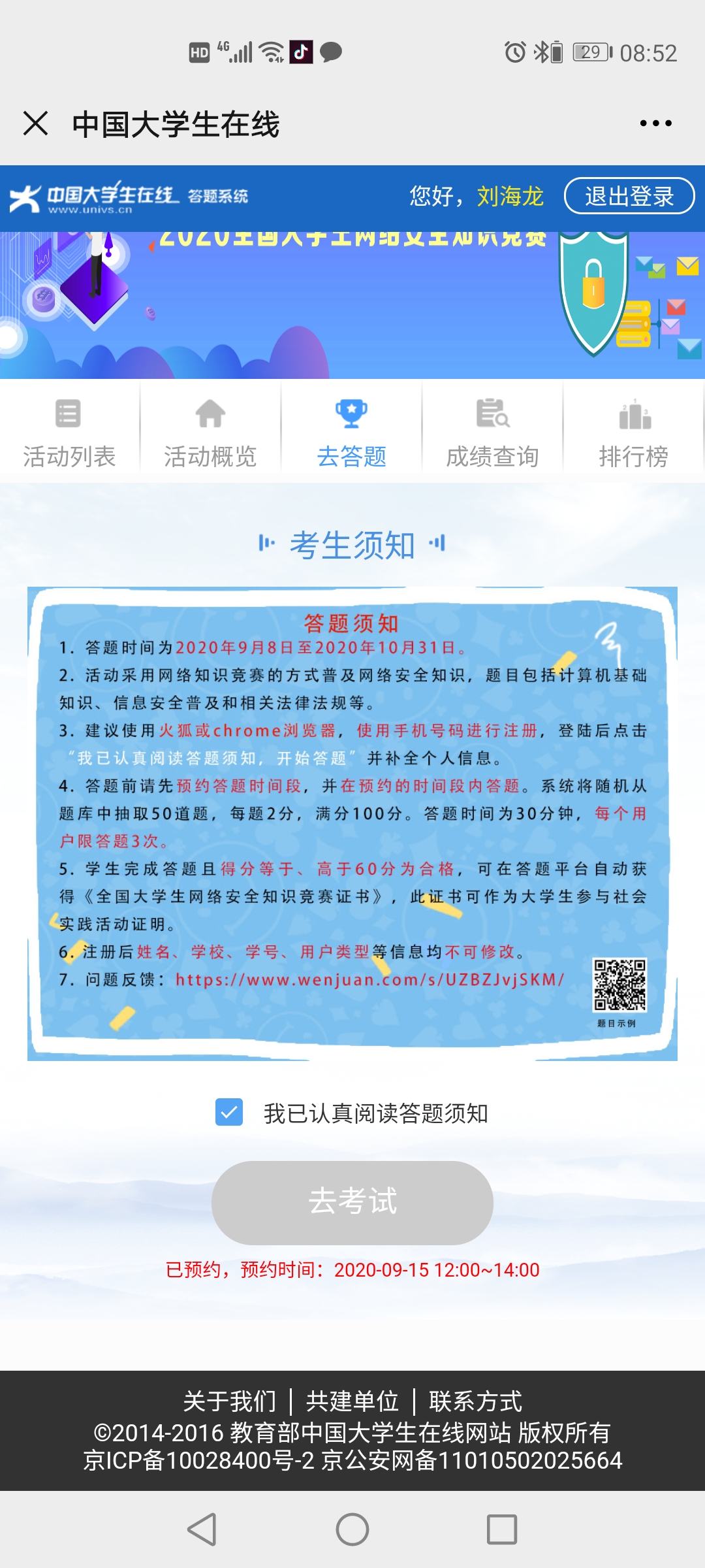 3、注册成功后,需要修改个人信息,修改后保存(如果显示不能保存,不用理会,直接返回,系统会自动保存),然后点击进入考试——去答题——预约,在预约时间段进行答题,合格后会发放证书,将证书保存(或截图)上交。