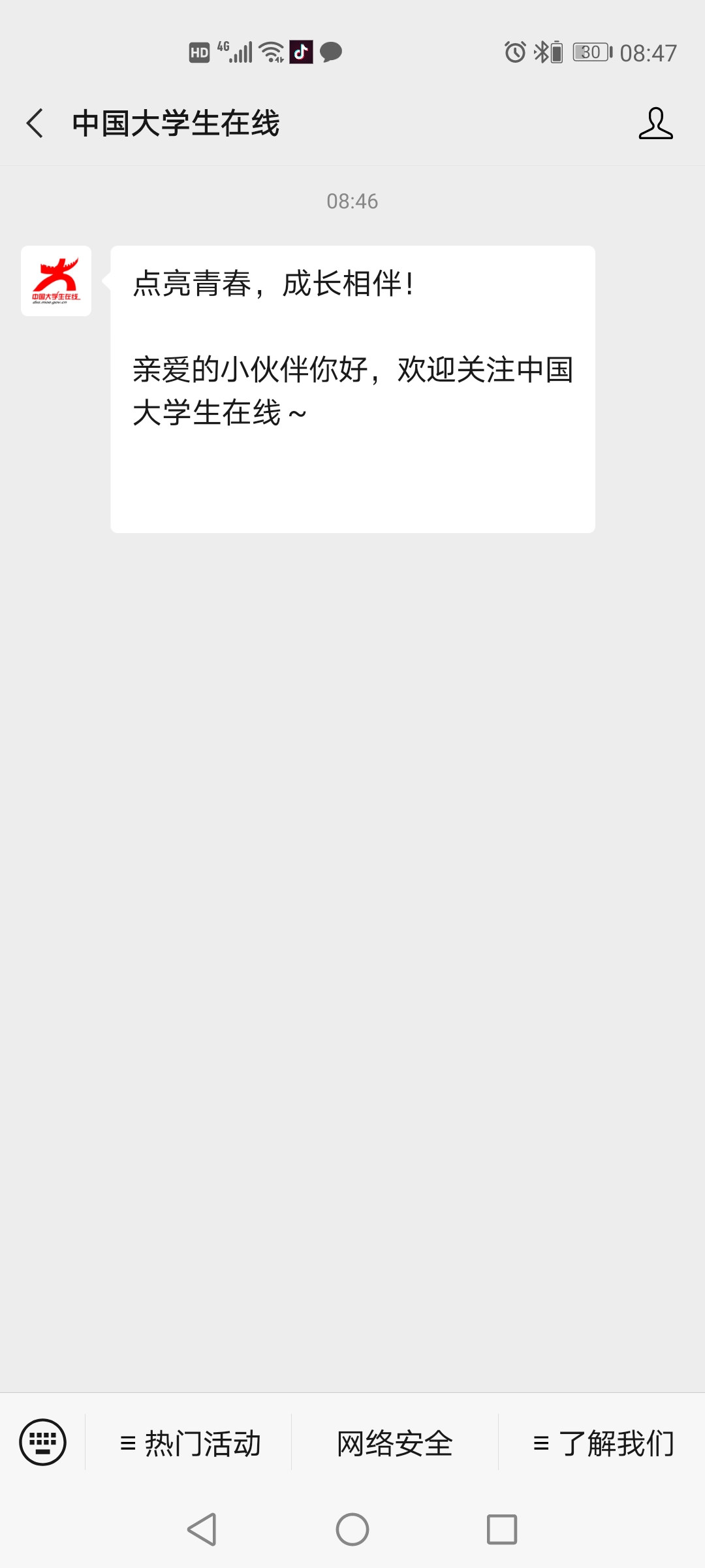 打开微信,搜索“中国大学生在线”公众号,关注后进入公众号。