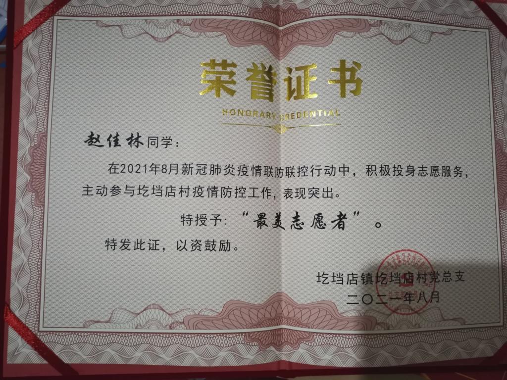 2021年8月3号开始,在河南省焦作市武陟县圪垱店乡圪垱店村村口卡点处值班,量体温、排查、宣传,排查每户基本信息和调查外来人员等基本信息,把排查到的基本信息录到电脑上。