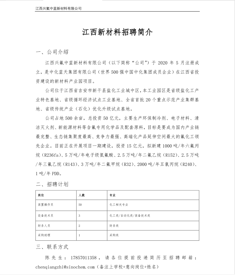 江西兴氟中蓝新材料有限公司招聘简章